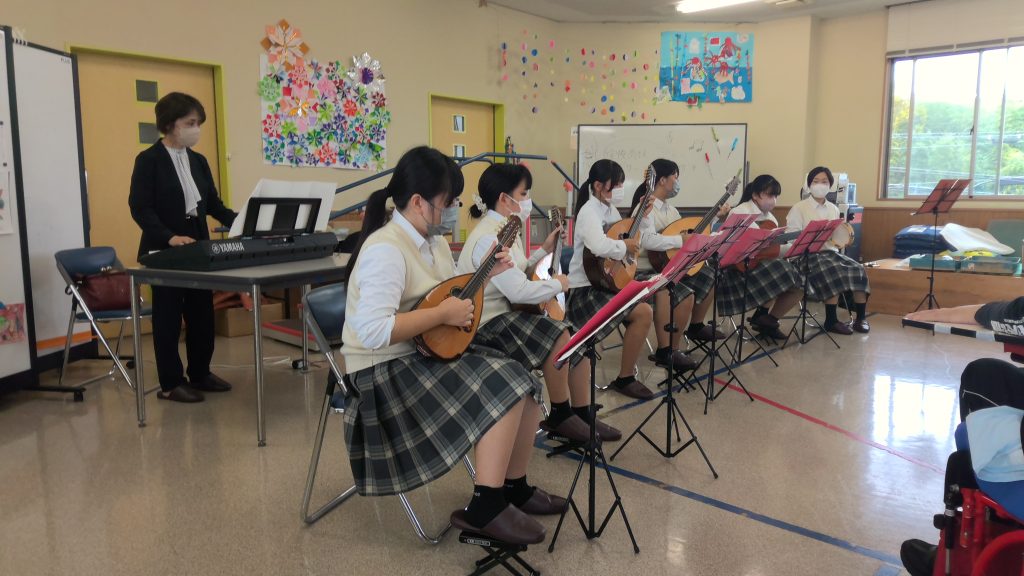 本校ギターマンドリン部は、10月18日(土)社会福祉法人新城福祉会西部福祉会館にて行われた余暇活動の一環として演奏会を行いました。途中には楽器紹介も交え、マンドリンやギターの音色や特徴をわかりやすく紹介しました。演奏中は会場全体があたたかい雰囲気に包まれ、利用者の皆さまが笑顔で手拍子をしたり、タンバリンや鈴を手に取って一緒に演奏を楽しむ姿も見られました。音楽を通して交流を深めることができ、部員にとっても心温まる貴重な経験となりました。