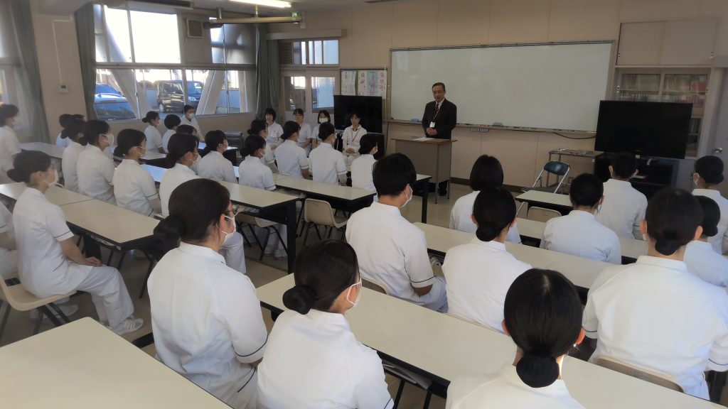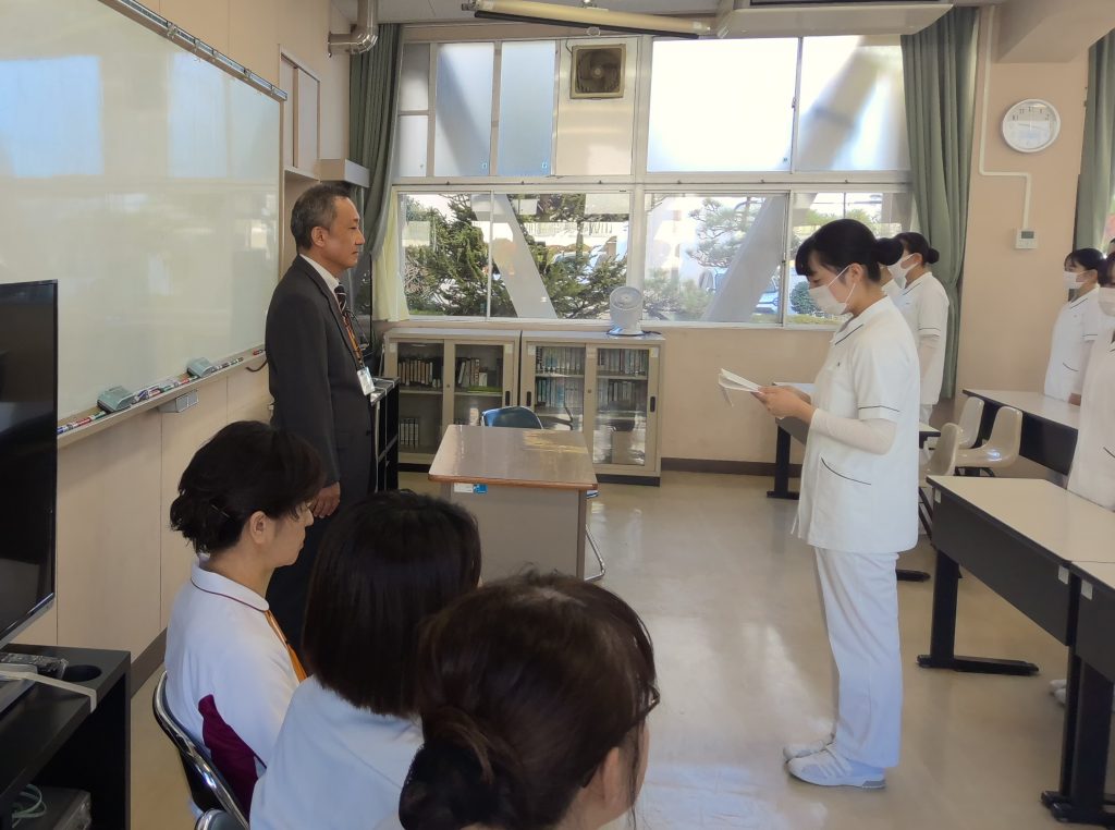 11月20日~12月17日までの18日間の実習を終えて閉講式をを迎えました。生徒代表お礼の詞では、「患者様の優しさに触れ少しずつできることが増え、自分の成長を実感するとともに同じ看護師になるという夢を持った仲間と支え合いながら乗り越えることができました。」と述べられていました。実習での経験をグループ活動を通して共有し、学びを深め3年生の実習につなげていけれるようにします。